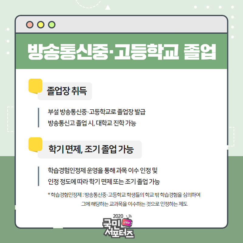 그리고 3년이라는 시간 동안 수업에 성실히 출석하면 ‘○○중학교 부설 방송통신중학교’, ‘○○고등학교 부설 방송통신고등학교’로 졸업장이 발급되며, 방송통신고등학교 졸업자의 경우, 대학교 진학 또한 가능해집니다.