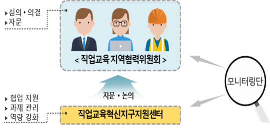 신청과정에서도 볼 수 있듯이, 이번 사업의 성공적 추진을 위해서는 지자체, 고등학교, 대학교로 이어지는 다양한 주체 간 협력이 필수적입니다. 또한, 이들의 다원적인 의사결정과 협력을 돕는 추진 체계가 필요합니다. 교육부에서는 이를 위해 지자체와 교육청 간 협약 후 기관 간 협력을 주도할 ‘직업교육지역협력위원회’와 사업을 주관할 전담 조직인 ‘직업교육혁신지구지원센터’를 구성해야 함을 강조하였는데요.