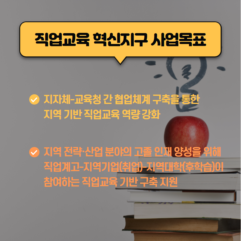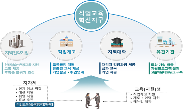 직업교육 혁신지구란 지자체와 교육청이 협력하여 지구 내에 있는 직업계고와 지역기업, 지역대학 간 연계를 통해 고졸 인재 성장을 지원하는 직업교육 기반이자 플랫폼이라고 할 수 있습니다. 지자체와 교육청, 기업이 함께 협력하여 고졸 인재들을 위해 기업을 발굴하고, 직업 심화 교육 제공, 현장실습 등을 제공하는 등의 시스템을 구축한다고 생각하시면 될 것 같습니다.