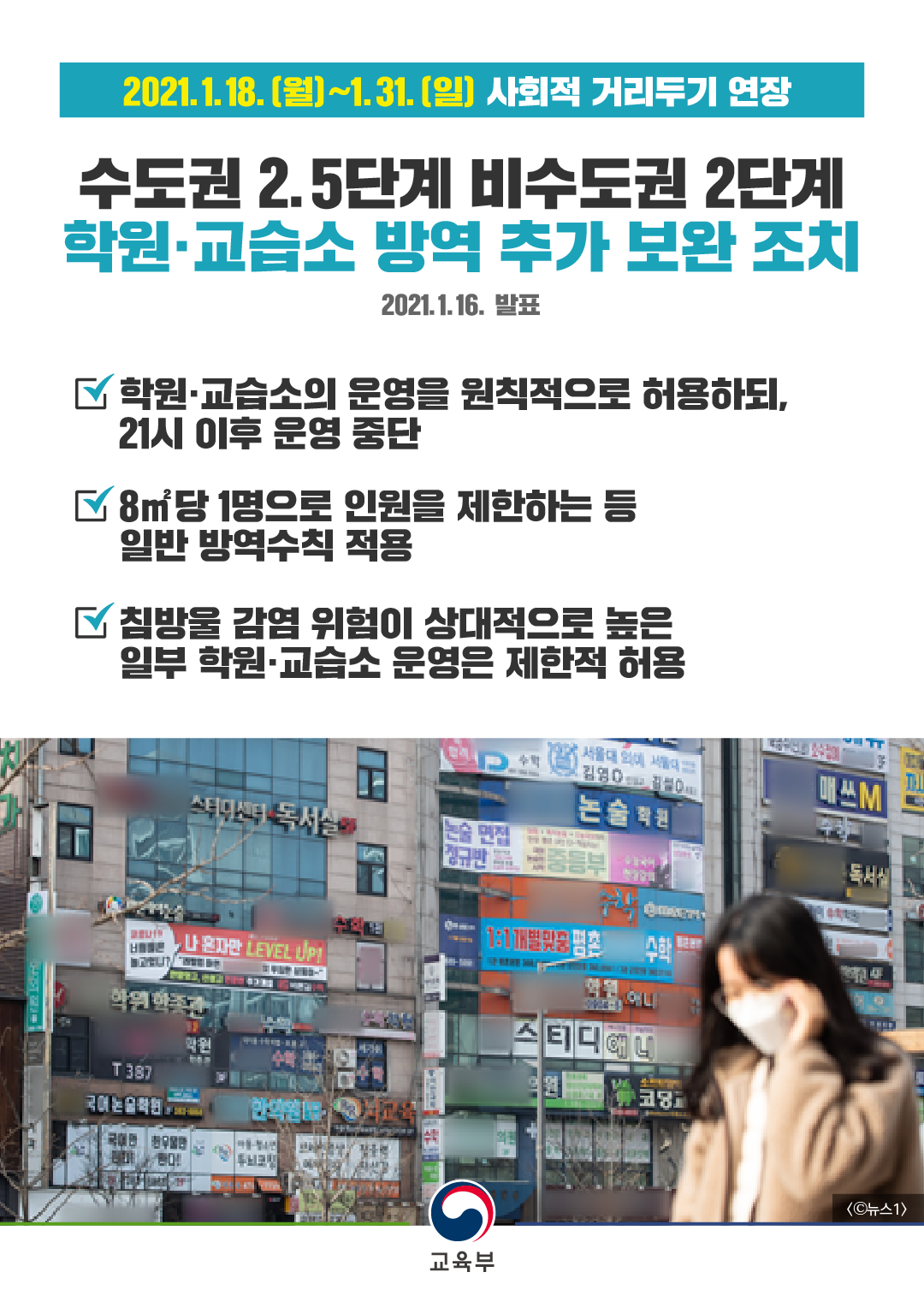 수도권 2.5단계, 비수도권 2단계 연장에 따른 학원 및 교습소의 방역 추가 보완 조치가 시행됩니다.