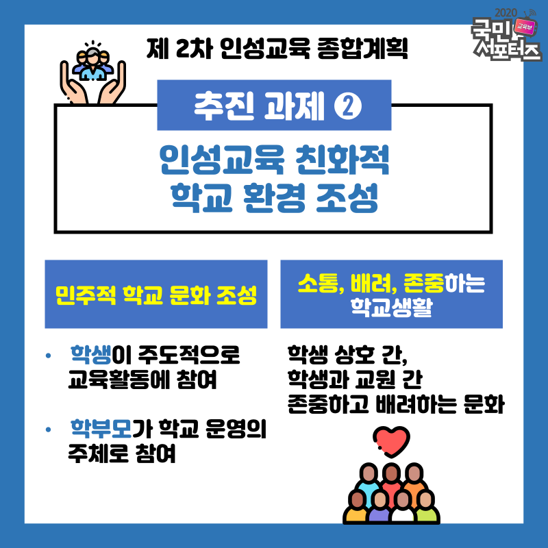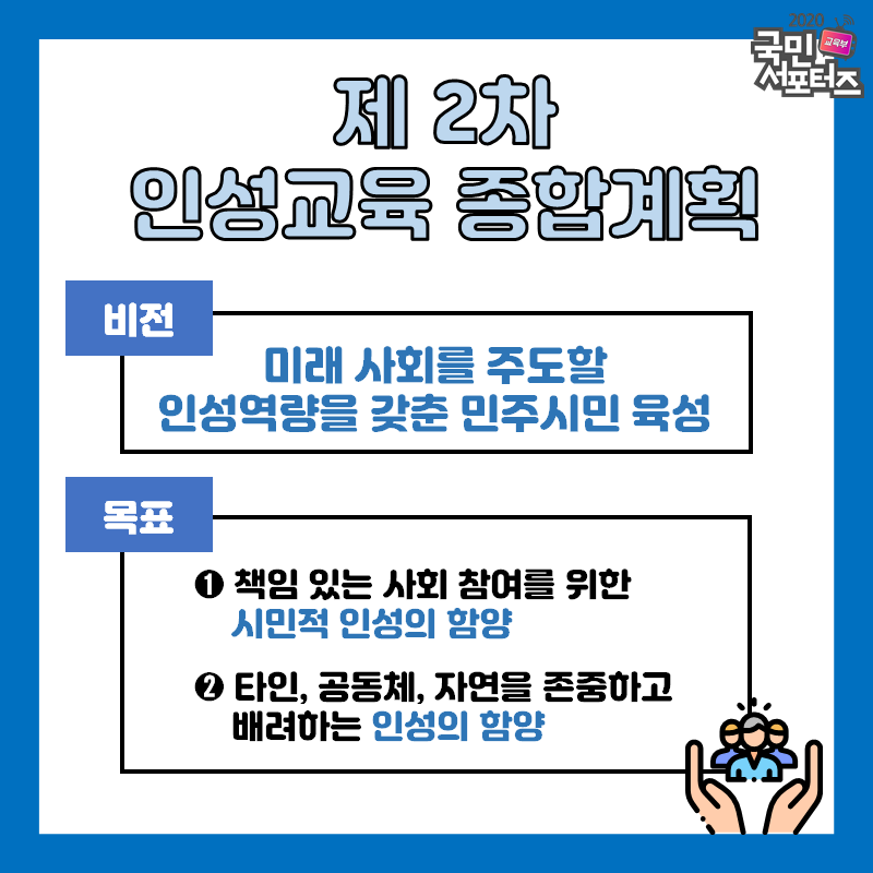 학교 인성교육의 내실화, 그리고 가정과 지역사회에서의 인성교육 회복이라는 기대효과를 가지고 있는 제2차 인성교육 종합계획을 통한 변화를 기대해주세요!