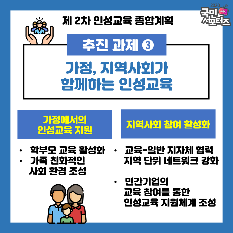 학교에서의 교육이 가정에서 이어질 수 있도록 자녀 지도 방법 등 학부모 교육을 활성화하고 가족 친화적인 사회 환경을 조성하고, 온라인 학부모 교육, 찾아가는 학부모 교육을 통해 학부모의 자녀 인성교육 역량을 강화합니다. 정부 부처, 지자체에서는 직장교육을 제공하여 부모교육 확산을 선도합니다.