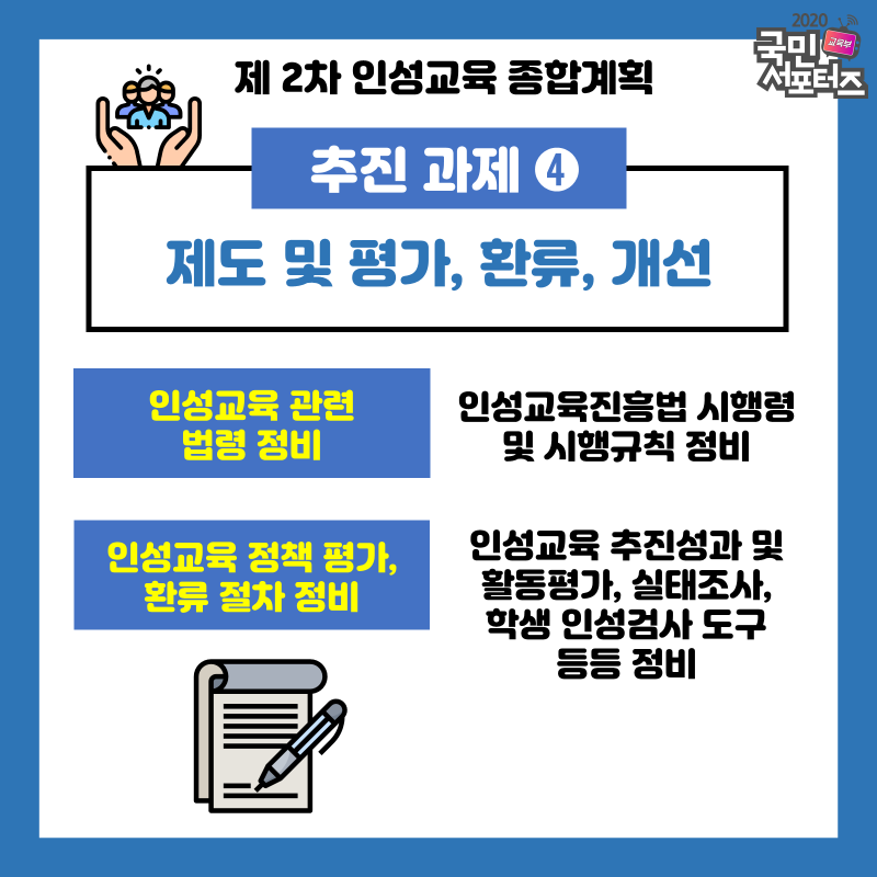 인성교육 추진성과 및 활동 평가, 인성교육 실태조사, 학생 인성 검사 도구의 목적, 내용, 방법 등을 정비합니다.