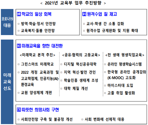 유은혜 부총리 겸 교육부장관은 “올해에는 코로나19를 현명하게 극복하며 학교의 일상을 회복하는 데에 총력을 기울일 뿐만 아니라, 지난해 위기 속에서 이루어낸 교육 현장의 도전과 변화를 토대로 우리 교육의 더 큰 도약을 시작하는 한 해로 삼을 것이다.”라고 밝혔다.