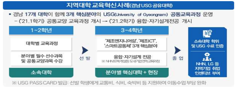 경남 공유대학(USG : University System of Gyeongnam) 등 지역혁신 플랫폼을 통한 우수 지역인재 양성이 본격화되고 있으며, 인재 양성뿐 아니라 지역 내 취‧창업 지원, 다양한 혁신 클러스터(혁신도시, 캠퍼스 혁신파크 등)와 연계한 정주여건 개선 등 종합적인 지원책을 마련하여 시행하고 있다.