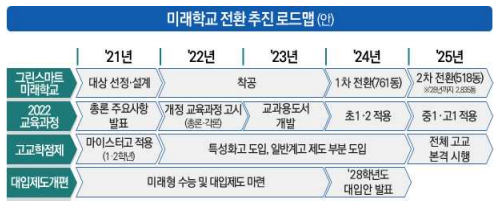 * (교육부) 학교단위 : (2019) 57개교 선정→(2020~) 기획·설계·공사→(2021) 순천별량중 등 12개교 완성→(2022~2025) 45개교 단계적 완성 / 교실단위 : (2019) 588개교 → (2020) 618개교