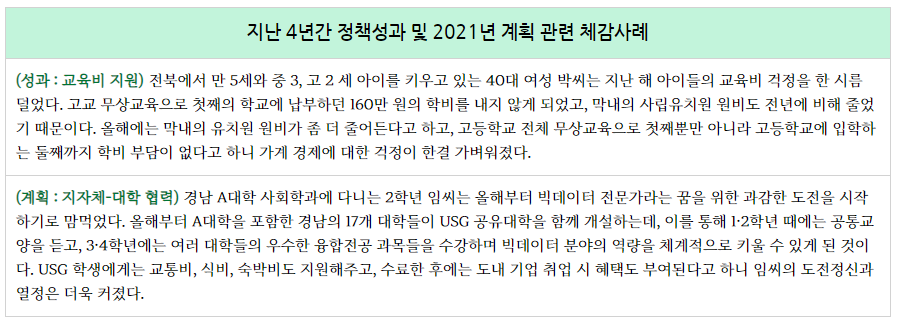 유아부터 성인까지 생애단계별 교육비 부담 경감을 지속 추진하며, 특히, 올해는 고교 무상교육이 전면 시행되어 초등부터 고등학교까지 무상교육이 실현되고, 유아 누리과정 지원단가도 2년 연속 2만 원 인상(2020. 24만원 → 2021. 26만원)되어 가계 부담을 덜어줄 것으로 기대된다.