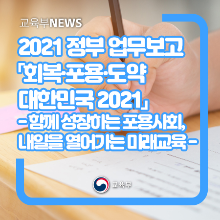 교육부(부총리 겸 교육부장관 유은혜)는 1월 26일(화) ‘함께 성장하는 포용사회, 내일을 열어가는 미래교육’이라는 비전으로 2021년 업무계획을 발표했다.