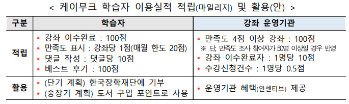 (학습 이력 연계) 케이무크 이수증(온라인)을 평생학습계좌제 및 공공‧민간 등의 취업 지원 누리집과 연계하고, 케이무크 이수 결과를 학습 자원화 하여 취업 등에 활용하도록 단계적으로 추진한다.