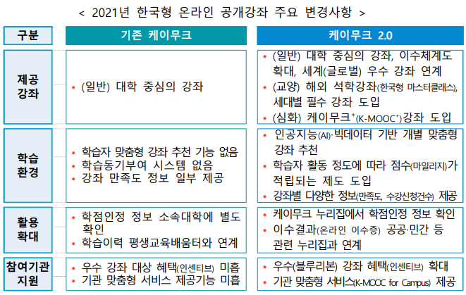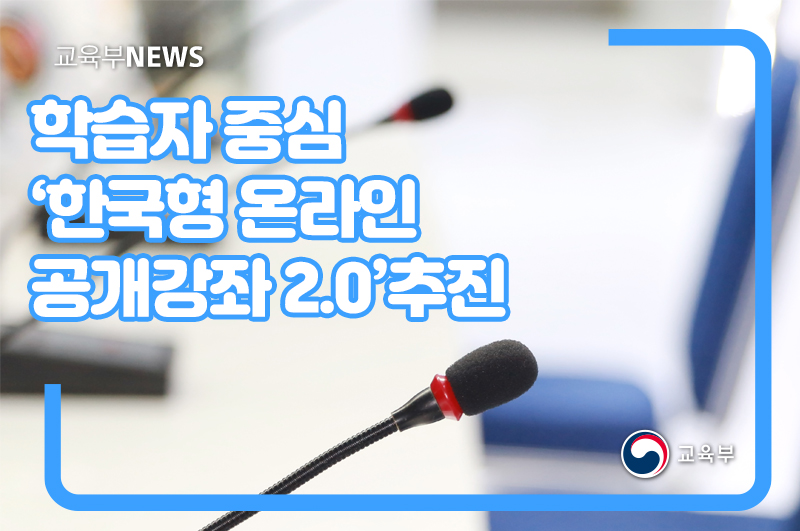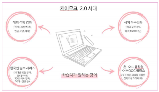 교육부(부총리 겸 교육부장관 유은혜)와 국가평생교육진흥원(원장 윤여각)은 1월 28일(목), 급변하는 미래사회에 대비하여 모든 국민이 성장할 수 있도록 학습자 중심 ‘한국형 온라인 공개강좌(이하 케이무크*) 2.0’을 추진한다고 밝혔다.