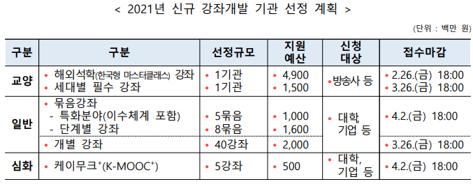 이번 신규 강좌개발 기관 선정규모는 아래표와 같고, 강좌 개발에 관심 있는 대학, 방송사, 기업 등은 접수마감일까지 사업계획서 등 관련 자료를 제출해야 한다.