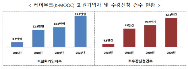 특히, 작년에 코로나19 확산으로 비대면 교육 수요가 증가하면서 케이무크의 신규회원가입자 수가 전년 대비 58% 증가한 23.4만 명, 수강신청 건수도 전년 대비 33% 증가한 52.2만 건이었다.