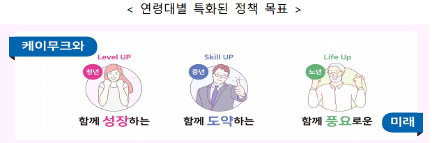 이에 교육부는 “모든 국민에게 세계 최고의 지식과 경험을 공유”한다는 비전으로 연령대별 특화된 정책 목표를 두며 ‘학습자 중심 케이무크(K-MOOC) 2.0’을 추진하기로 하고, 전년 대비 약 100% 증가된 총 237억 원을 투자하기로 하였다.
