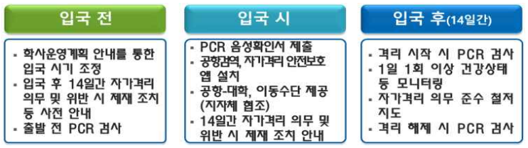 대학별로 유학생 입국 관리 계획을 수립하고 입국 정보를 지자체와 공유하도록 하여 지자체의 자가격리 관리 인력과 진단검사 물량 등 방역관리 여건 내에서 유학생이 입국하도록 추진한다.