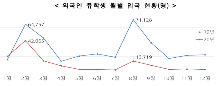 원격수업 확대 및 질 향상, 다음 학기 수강가능 학점 확대, 불필요한 출국 후 재입국 자제 등 입국 분산·감소 방안을 추진한 결과, 2020학년도 2학기(7~12월) 국내 입국한 외국인 유학생은 총 3만 명으로, 이전 학기 대비 65%, 2019. 2학기 대비 84% 감소하였다.