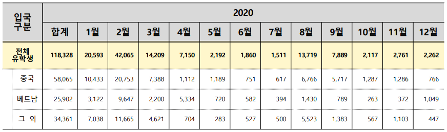 전 세계적으로 코로나19가 확산되기 시작한 지난해 3월부터 12월까지 입국한 유학생 5.6만 명 중 총 165명(국내 감염 제외)이 확진되었으며,