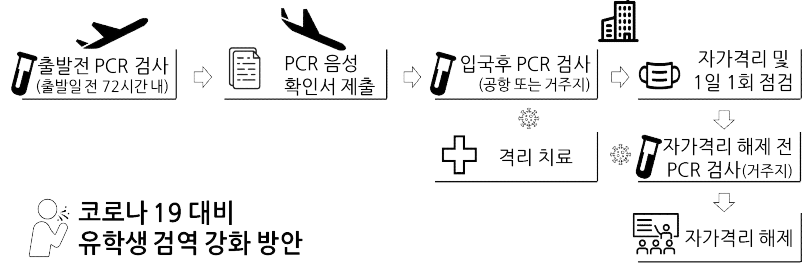 교육부는 입국 유학생 전원에게 격리해제 전까지 코로나19(PCR) 검사를 3회 받도록 하여 검역 조치를 강화할 예정이다.
