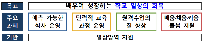 이번 지원 방안은, 안정적이고 탄력적인 학사 및 교육과정 운영, 원격수업 내실화, 학습격차·돌봄에 대한 개선 요구가 지속되고 있는 상황을 고려하여, 학교 일상의 회복을 지원하기 위해 마련되었다.