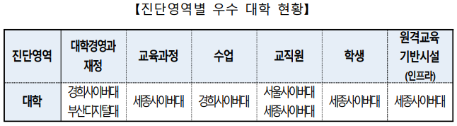경희사이버대학교는 대학경영과 재정 및 수업 영역에서, 부산디지털대학교는 대학경영과 재정 영역에서, 서울사이버대학교는 교직원 영역에서, 세종사이버대학교는 교육과정, 교직원, 학생, 원격교육 기반시설(인프라) 영역에서 각각 우수한 것으로 평가되었다.