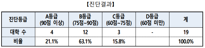 (A등급 4개 대학) 총 19개의 원격대학 진단 결과, 경희사이버대학교, 부산디지털대학교, 서울사이버대학교, 세종사이버대학교 등 4개 대학이 A등급을 받았다.