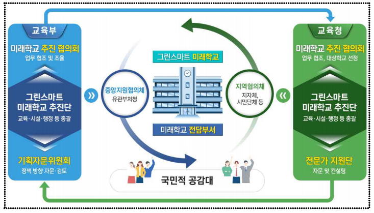 교육부와 교육청은 전담 업무조직 운영과 지원 체계 마련을 통해 미래학교 기획 단계부터 조성 이후 운영까지 사업 전반을 지원한다.