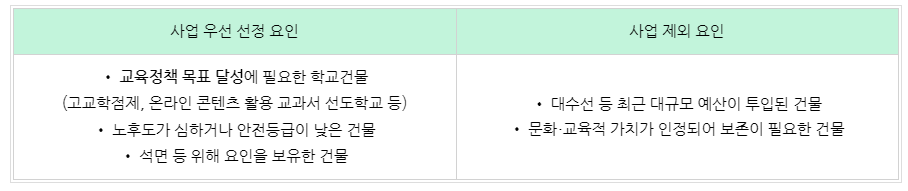 * (선정 기준) 40년 이상 경과된 노후학교를 대상으로 각종 교육정책 목적사업에 적합한 학교를 우선 선정