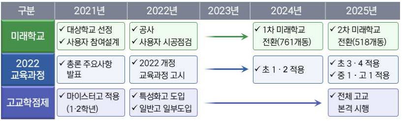 첫째, 교육과정과 교수학습, 학교 환경을 통합 전환하는 미래학교 선도 모형을 마련하고, 단계적으로 모든 학교를 미래학교로 조성한다.