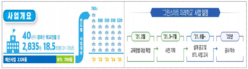 그린스마트 미래학교 사업은 40년 이상 경과한 학교 건물 2,835동을 대상으로 2025년까지 총 사업비 18.5조원*이 투입된다.