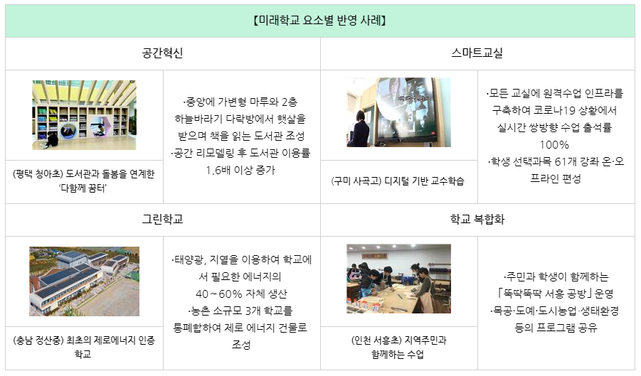 미래학교에는 공간혁신, 스마트교실, 그린학교, 학교 복합화 등의 요소가 포함되어, 학생의 건강, 바른 인성, 효과적 학습 등에 필요한 미래형 학교 환경으로 전환된다.