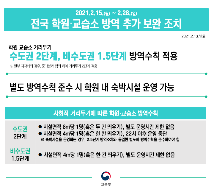 ✔ 별도 방역수칙 준수 시 학원 내 숙박시설 운영 가능
