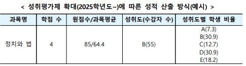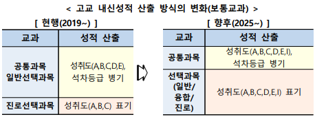 2019학년도부터 보통교과 진로선택과목에 적용되고 있는 성취평가제를 2025학년도(고1~)부터 모든 선택과목으로 확대 도입하여, 학생들이 학업 성취수준에 대해 보다 정확하게 평가받을 수 있도록 하고, 진로·적성에 따른 과목 선택 역시 도울 예정이다.