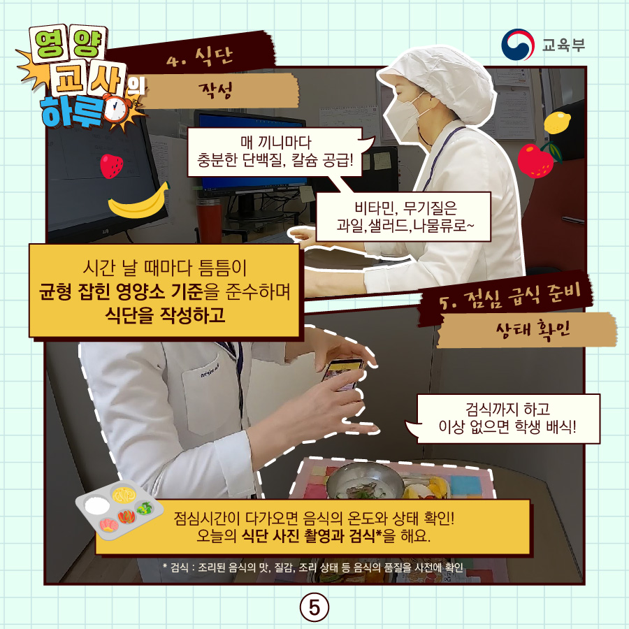 ✔ 식단 작성, 식재료 선정 및 검수, 위생 관리, 식생활 교육 등 학교급식 업무를 담당하는 교사