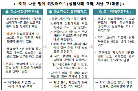 코로나19로 인해 학업흥미 상실, 무기력 상태에 빠진 학생이 심리‧정서 및 학습법 상담을 통해 자신감을 회복하고 스스로의 학습 목표를 성취해 나아가는 사례 등을 통해 현장 이해도를 제고하였다.