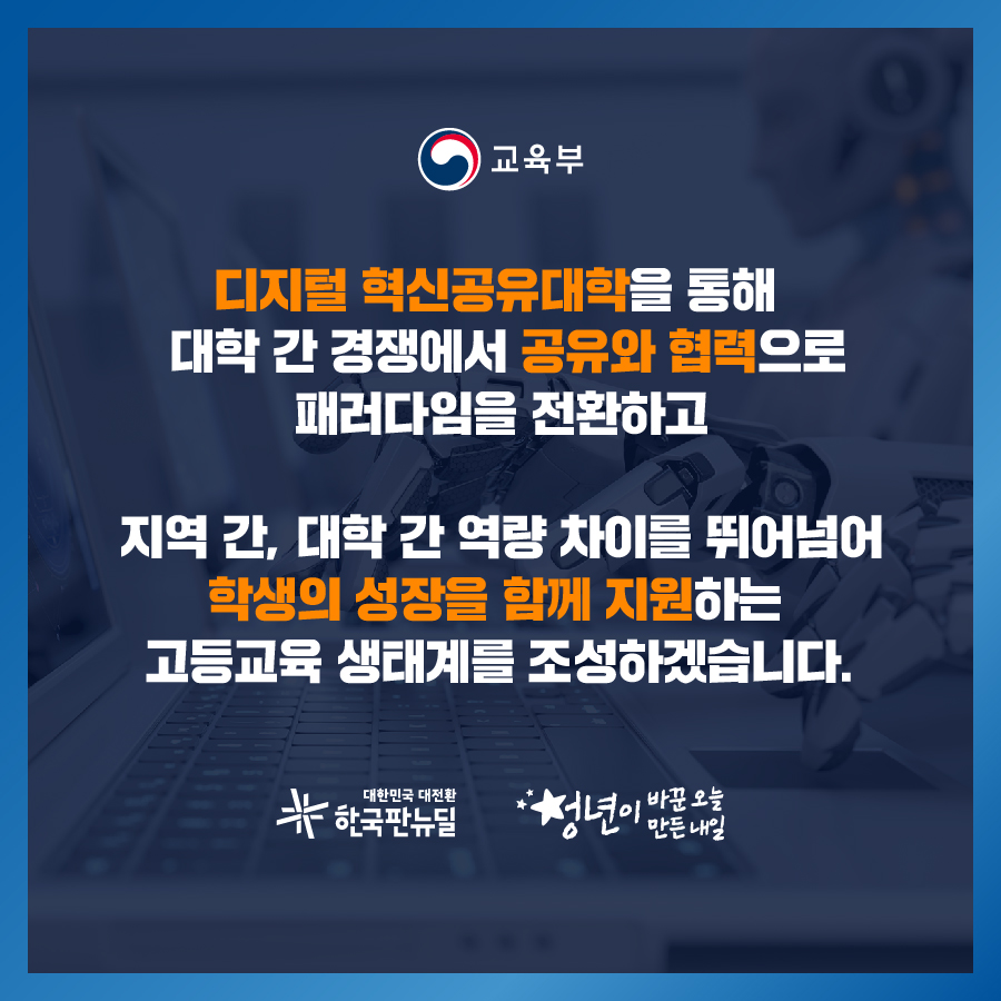 디지털 인재양성 혁신공유대학 사업('21~'26)- 지역·대학 간 교육격차 해소- 국가 수준의 첨단분야 인재양성 체계 구축