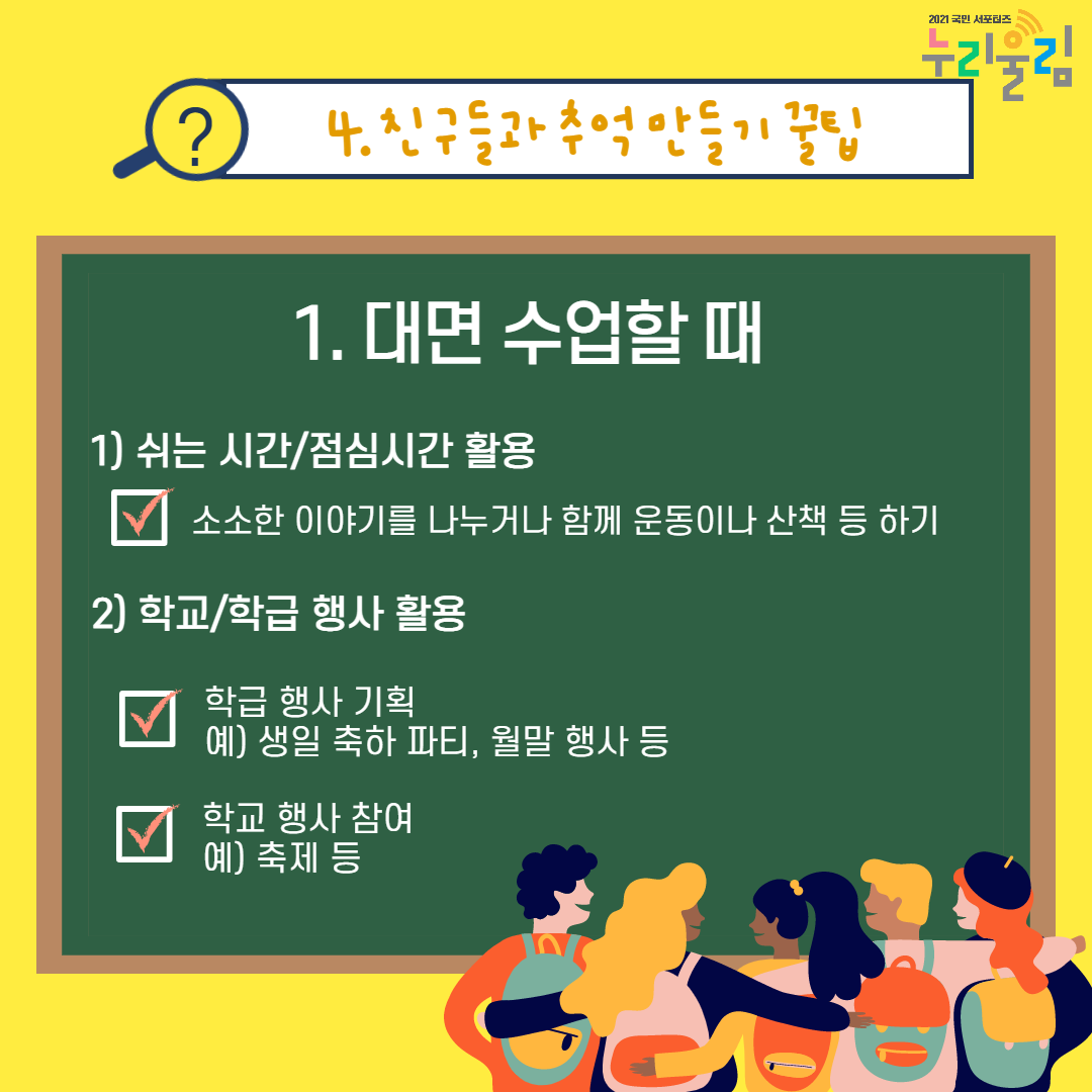 코로나 19의 장기화로 인해 학교에서는 올해도 대면과 비대면 수업을 같이 진행하게 되었습니다. 친구들과 만나는 시간이 줄어듦으로 인해 추억 쌓기가 어려워졌지만, 현 상황 속에서 최대한 추억을 많이 만들 수 있는 방법을 제안해보았습니다.