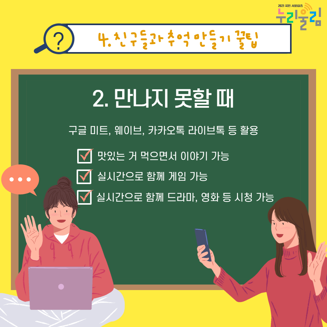 대면 수업을 하지 않아서 혹은 코로나로 인해 친구들과 만남이 어려울 경우, 온라인 쌍방향 플랫폼을 활용할 수 있습니다. ‘구글 미트, 웨이브, 카카오톡 라이브톡 등’을 통해 실시간으로 서로에 대해 공유할 수 있습니다. 영상을 켜놓고 맛있는 것을 각자 먹으면서 이야기를 나눌 수 있고, 공부하는 모습을 공유함으로써 서로 의지가 되고 동기가 되어줄 수 있기도 합니다. 또한, 함께 영상 매체를 볼 수도 있고, 게임도 할 수 있어요! 이렇게 비대면으로도 친구들과 추억 쌓기가 가능하답니다.