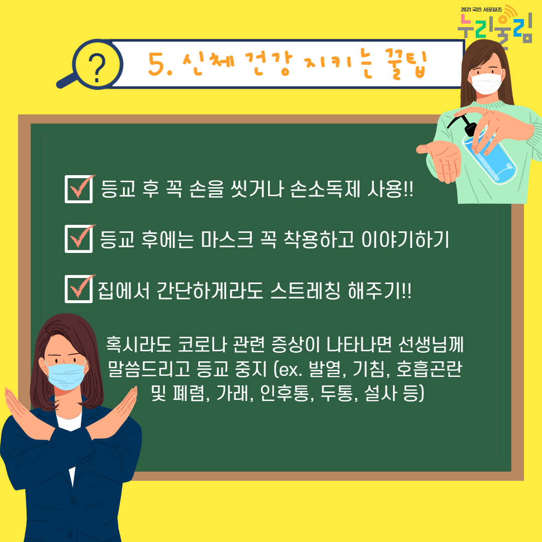 정신과 신체는 서로 밀접한 관계를 지니고 있어 영향을 주고받는 만큼 정신 건강을 위해서는 신체 건강을 지키는 것도 중요합니다. 등교 후에는 꼭 손을 씻거나 손 소독제 사용하여 위생 관리를 철저하게 하고, 등교 후에는 마스크 꼭 착용하고 이야기하는 것도 중요합니다. 서로 아프지 않고 건강하게 지내야 친구들이나 선생님들과 추억도 쌓고 공부도 할 수 있습니다. 그리고 무엇보다 몸이 아프면 마음과 정신에도 영향을 줄 수 있기 때문에 항상 건강하려고 노력하는 것은 중요해요. 그러니까 집에서 잠깐이라도 스트레칭을 해주면 좋을 것 같습니다. 혹시라도 코로나 관련 증상이 나타나면 선생님께 말씀드리고 등교 중지를 해주세요!