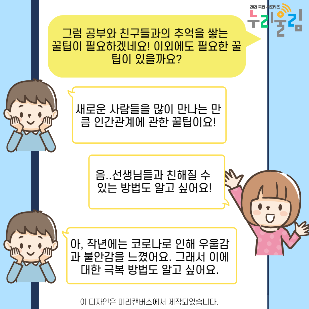 이런 팁들 외에도 알고 싶은 팁이 있는지 물어봤는데요, 선생님과 친해질 수 있는 방법과 인간관계에 대한 팁을 알고 싶다고 했습니다. 이러한 인터뷰 내용을 바탕으로 ‘선생님들과 유대감 쌓기 꿀팁’, ‘내신 관리 꿀팁’, ‘인간관계 꿀팁’, ‘친구들과 추억 만들기 꿀팁’을 알려드리고자 합니다! 또한, 코로나19의 장기화로 인해 우울과 불안을 겪는 청소년들이 증가하였고, 새로운 학기가 시작하는 만큼 두려움이나 불안감을 느낄 수도 있습니다. 정신과 신체는 서로 영향을 미치기 때문에 ‘신체 건강 지키는 꿀팁’과 ‘우울함/불안감 극복하는 꿀팁’에 대해서도 알려드리려고 합니다.