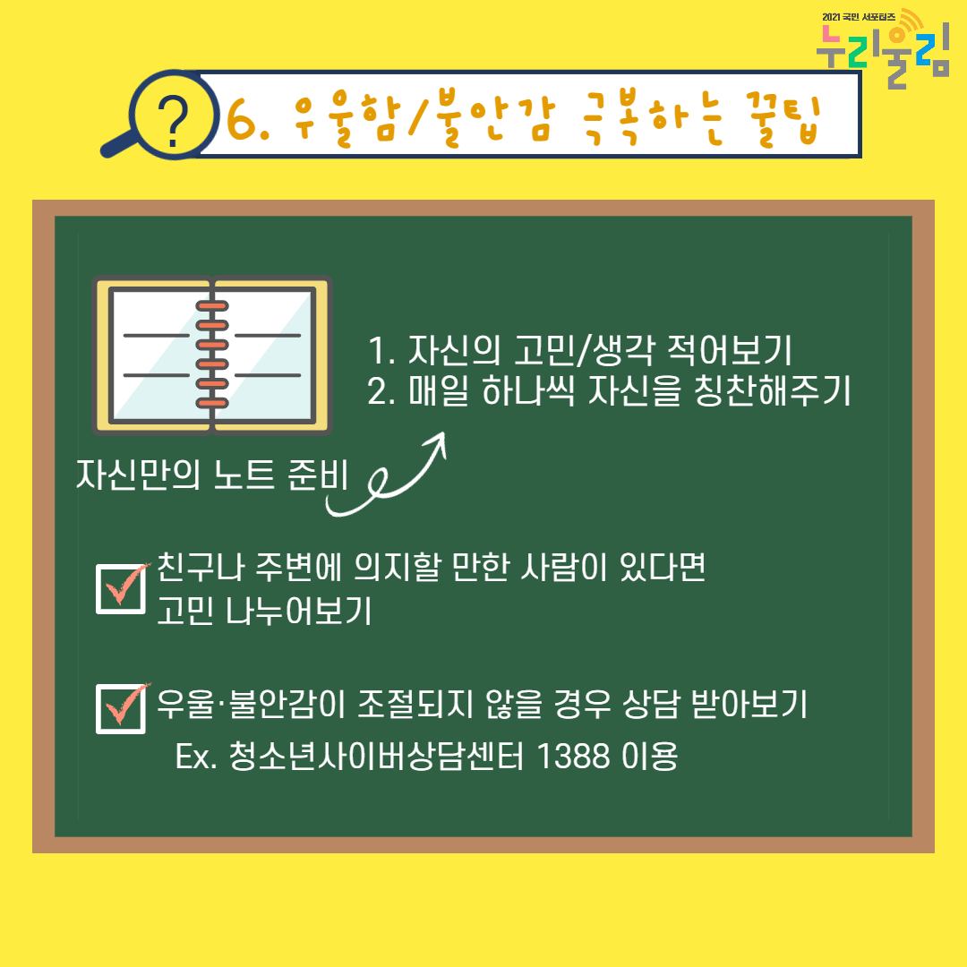코로나 19로 인해 우울함, 불안감을 느끼는 사람들이 많아졌다고 합니다. 특히, 청소년들이 상당히 증가한 것으로 알려졌습니다. 우울함과 불안감을 느끼는 게 이상한 것이 아니라는 점을 꼭 아셨으면 좋겠습니다. 우울함과 불안감을 느낄 때 극복할 수 있는 방법을 제안해보고자 합니다.