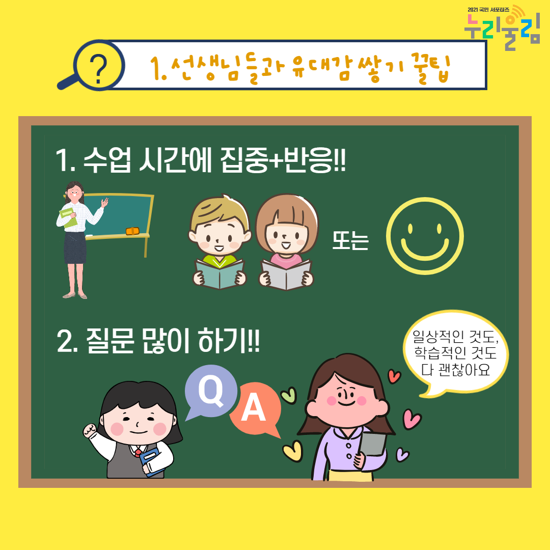 그리고 질문을 많이 하는 거랑 친해지는 거랑 무슨 상관이 있는지 궁금해하실 것 같은데요, 질문한다는 것은 관심이 있다는 것을 보여주기도 합니다. 일상적인 질문도, 학습적인 것과 관련된 질문도 좋습니다! 학생들의 관심을 싫어하는 선생님은 거의 없답니다. 선생님께 예의는 항상 갖춰야 하는 것을 잊지 말아 주세요!