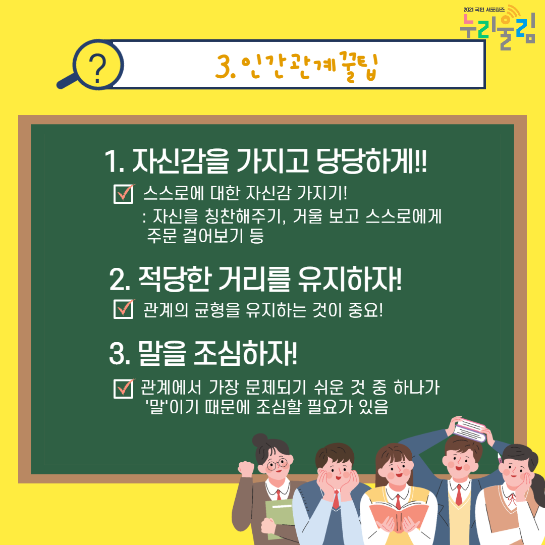 그리고 우리가 꼭 명심해야 할 것 두 가지가 있습니다. ‘적당한 거리를 유지하고 말을 조심하는 것’인데요, 사실 청소년기에는 친구들이 가장 중요한 존재라고 생각을 하고 굉장히 가까워지려고 합니다. 하지만 가까우면 가까울수록 우리는 이 정도는 이해해주겠지’라고 생각하면서 서운하게 만드는 등 실수하거나 때로 상대로부터 서운함을 느끼기 쉬워지는 것 같습니다. 따라서 관계에 있어서 균형을 잘 만들어서 유지하는 것이 장기적으로 봤을 때도 서로에게 더 좋은 것 같습니다. 또한, ‘낮말은 새가 듣고 밤말은 쥐가 듣는다, 발 없는 말이 천 리 간다.’ 등 말과 관련한 여러 속담이 있는데요, 이처럼 ‘말’이 굉장히 큰 힘을 가진 것임을 알 수 있습니다. 인간관계에서 가장 문제 되기 쉬운 것 중 하나도 ‘말’이기 때문에 항상 말을 조심하려는 태도를 보이는 것도 중요합니다.