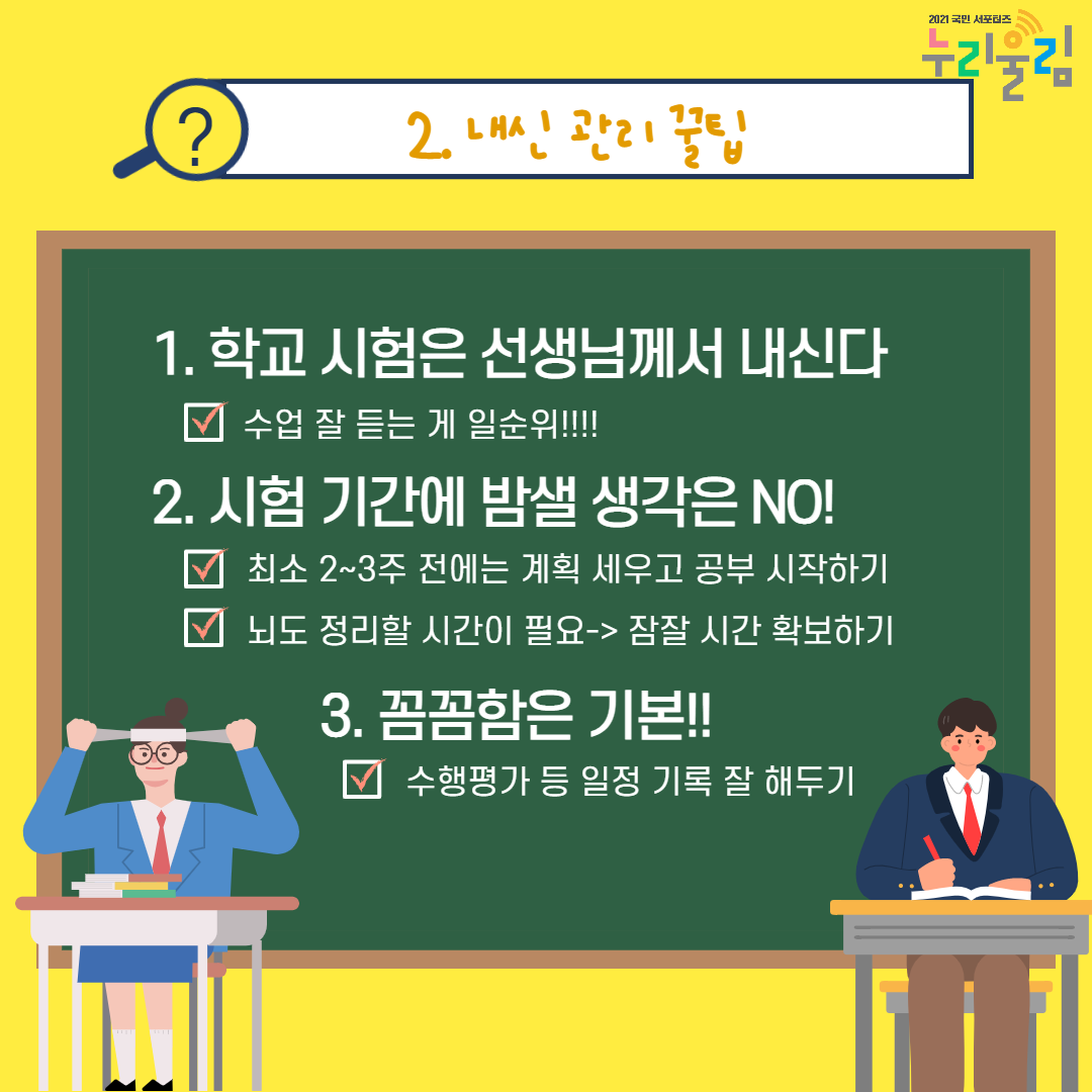 그리고 학기를 보내다 보면, 수행평가나 숙제 등으로 정신이 혼미할 때가 있습니다. 수행평가나 숙제 등은 꼭 날짜를 정리해두고 잘 챙기는 꼼꼼한 자세가 필요합니다.