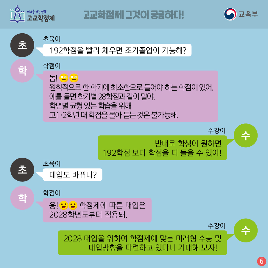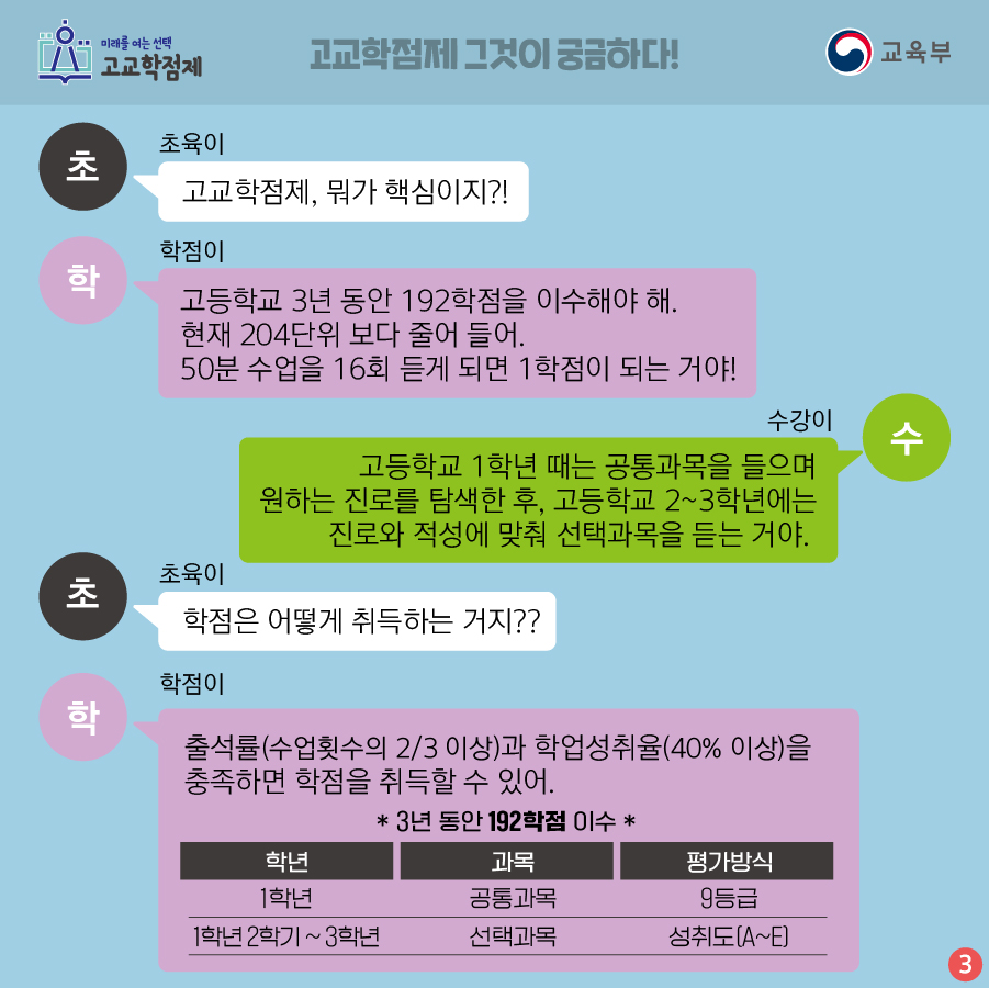 ✔ 고등학교 3년 동안 192학점을 이수해야 해. 현재 204단위 보다 줄어 들어. 50분 수업을 16회 듣게 되면 1학점이 되는 거야!