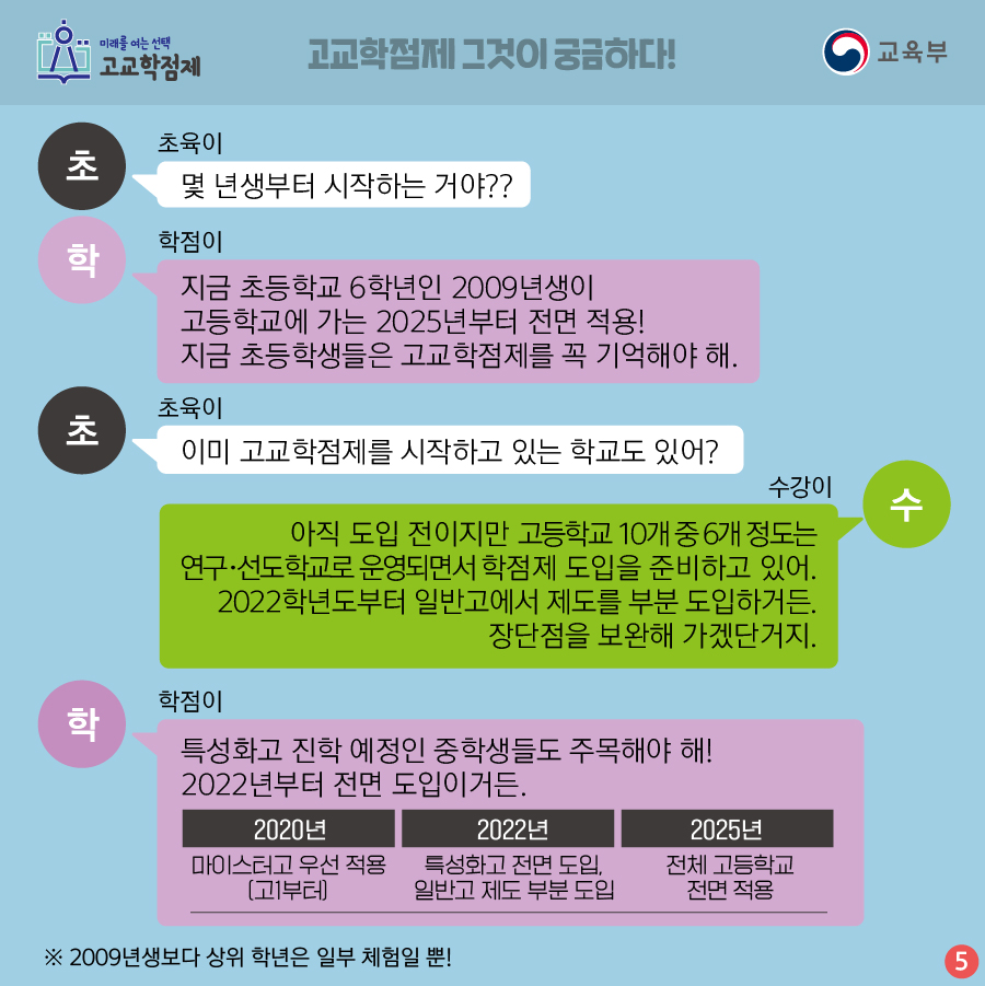 ✔ 지금 초등학교 6학년인 2009년생이 고등학교에 가는 2025년부터 전면 적용! 지금 초등학생들은 고교학점제를 꼭 기억해야 해.