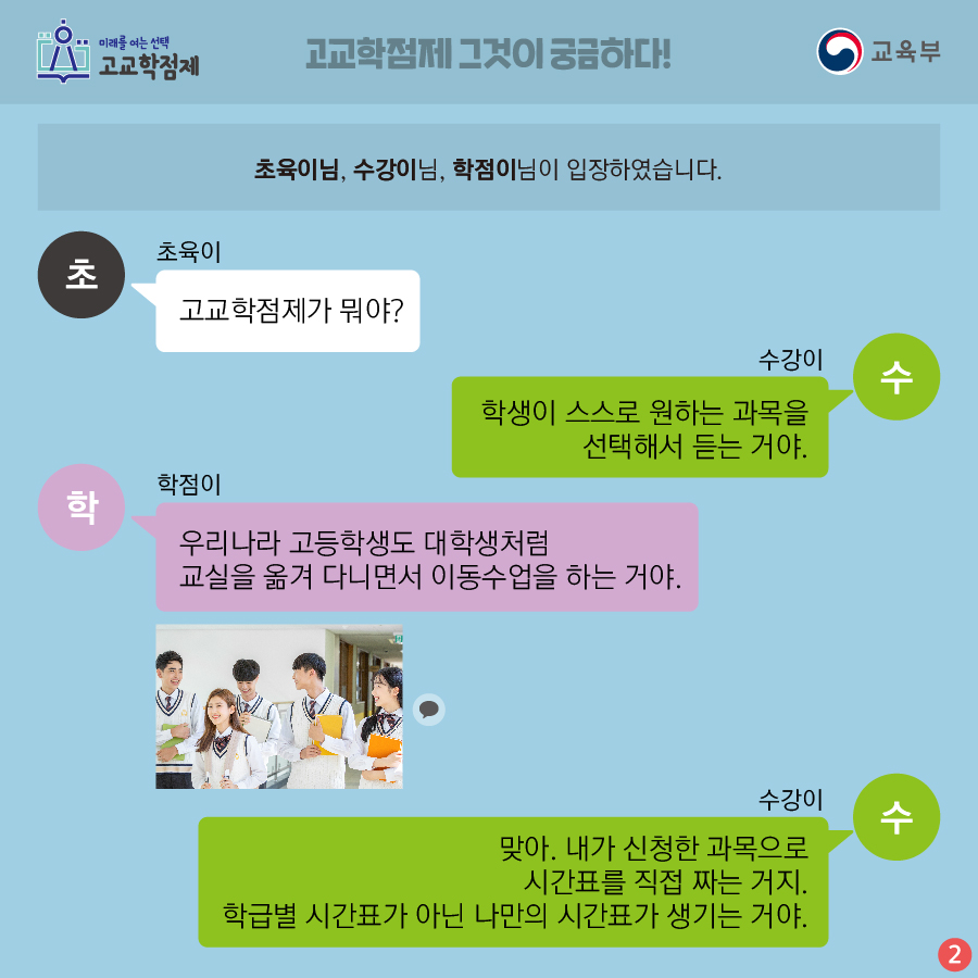 ✔ 우리나라 고등학생도 대학생처럼 교실을 옮겨 다니면서 이동수업을 하는 거야.