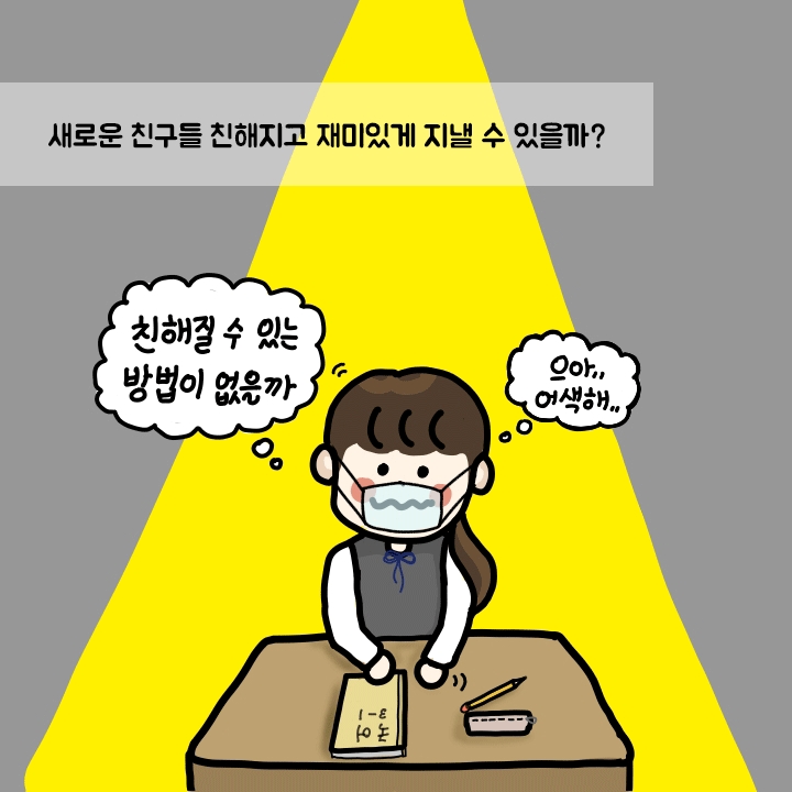 오늘 함께 할 친구 ‘누리’도 중학교에 막 입학해서 걱정이 많은 친구인데요, 누리는 특히 반 친구와 어떻게 하면 친해질 수 있을지 고민이 많다고 해요! 거리 두기로 인해 반 안에서도 친구들과의 거리가 멀어 더 걱정인 누리는 어떻게 친구들과 친해질 수 있을까요? 누리의 하루를 함께 보면서 반 친구와 친해질 수 있는 꿀팁을 확인해보세요!