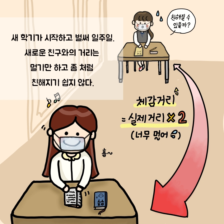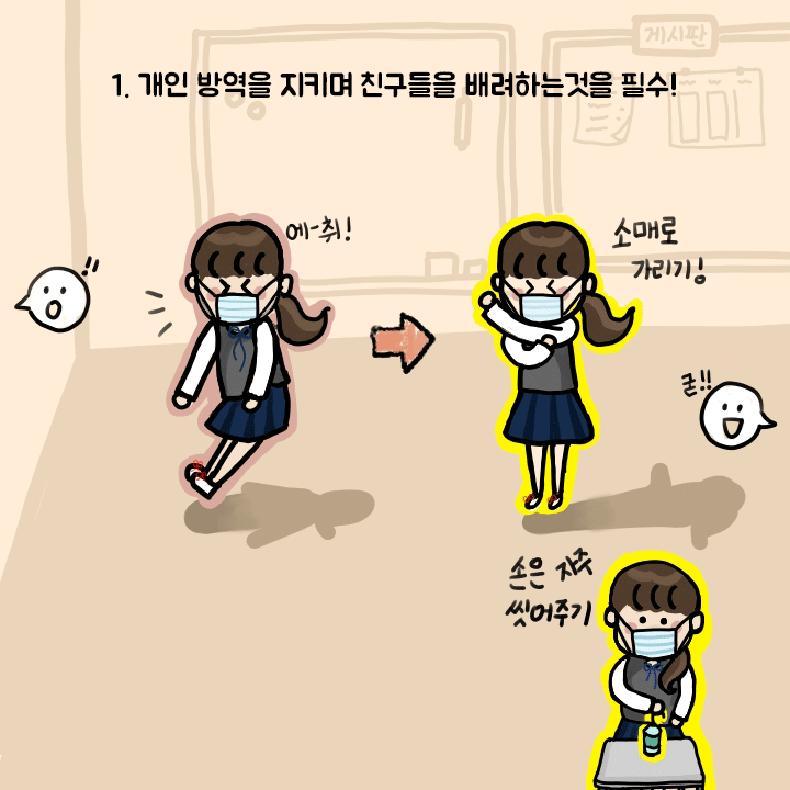 코로나19로 학교와 친구들 모두 방역을 위해 최선을 다하고 있어요. 위생에 예민한 시기인 만큼 친해지기 이전에 개인 방역을 철저하게 지켜서 서로를 배려하는 것이 중요해요. 항상 마스크를 사용하는 것을 물론이고, 재채기할 때는 친구가 서 있는 방향으로 하는 것이 아니라 고개를 팔 안쪽으로 숙여서 입과 코를 가린 후 해주세요! 손도 30초 이상씩 수시로 씻어주고, 밥 먹을 땐 대화하지 않는 것도 잊지 마세요. 개인위생과 방역에 철저한 친구들을 보면 코로나 걱정이 만들어낸 심리적 거리가 줄어드는 것처럼, 내가 개인위생과 방역에 철저하다면 다른 친구들 입장에서도 나에 대한 심리적 거리가 줄어들 수 있어요. 그렇다면 코로나 예방뿐 아니라 친구들과 친해지기 위해서도 개인위생은 선택이 아닌 필수겠죠?