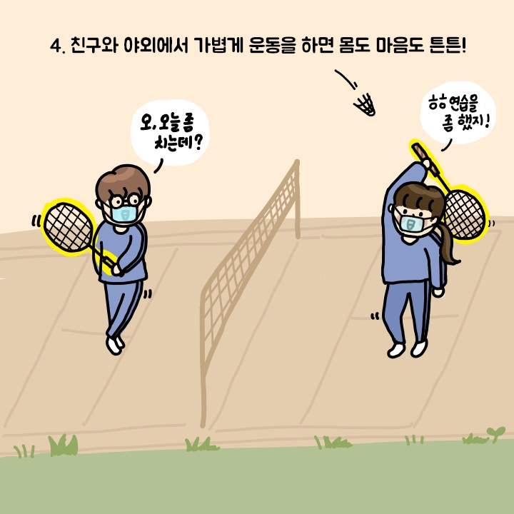 코로나19로 실내에서 하는 운동은 조금 힘들 수 있어요. 대신 탁 트인 야외에서 친구와 가볍게 운동을 해보는 건 어떨까요? 점심시간에 밥 먹는 동안 못 했던 이야기들을 학교 교정을 산책하며 나눌 수도 있고, 배드민턴을 치거나 소프트볼로 캐치볼을 할 수도 있어요. 더 나아가 반 친구들과 ‘미니 대회’를 열어서 점심시간마다 토너먼트 경기를 하는 것도 활력이 될 수 있답니다! 이렇게 점심시간을 활용해서 친구들과 운동을 하게 되면 몸도 건강해지고, 친구들과도 친해지는 1석 2조가 될 수 있겠죠?