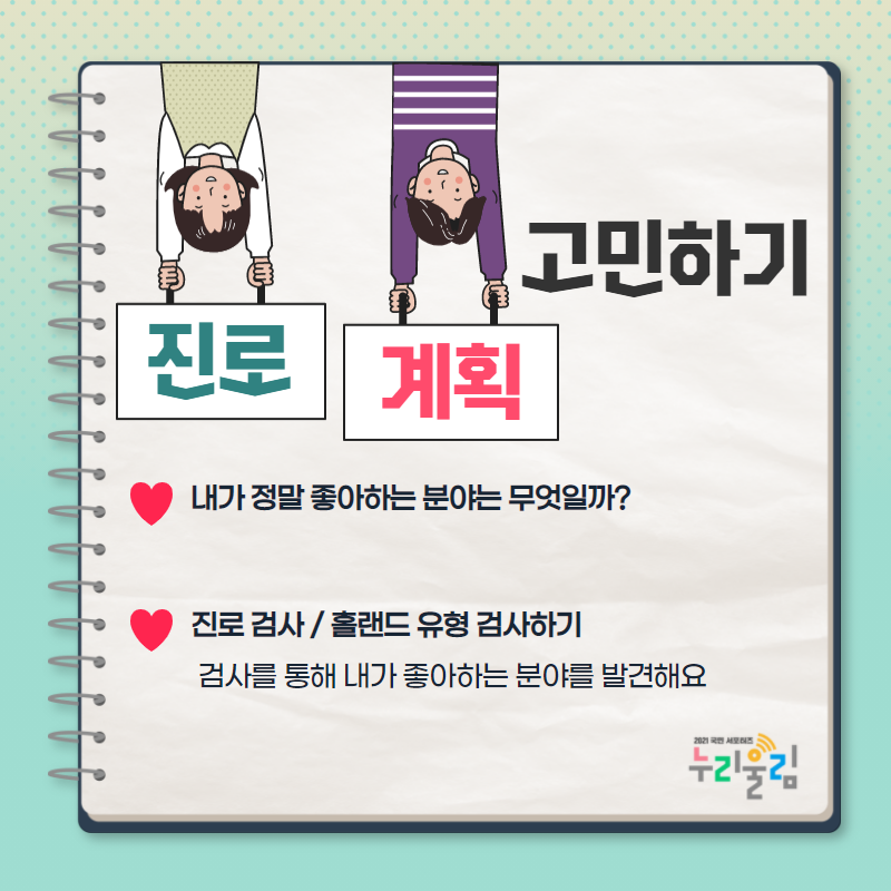 특히 학교에서 무료로 진행하는 다양한 진로 적성 검사에 꼭 진지하게 참여하세요. 이 결과들을 꼼꼼하게 읽으면 내가 어떤 것을 할 때 즐거워하는지 발견할 수 있답니다. 또 학교에는 진로상담을 전담으로 맡고 계신 진로 선생님이 계십니다. 진로 적성 검사 결과지를 해석하기 어려울 때, 진로 선생님께 방문하여 진로, 진학 분야에 대한 조언을 받을 수 있습니다. 잊지 마세요!
