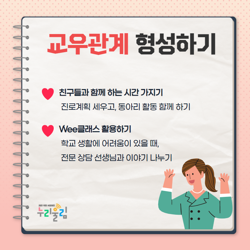 또 학교에는 Wee클래스가 있습니다. 전문 상담 선생님께서 항상 여러분을 기다리고 있으니 편한 마음으로 학교생활의 어려움을 호소한다면, 상담 선생님과 담임 선생님 모두가 여러분의 옆에서 힘이 될 것입니다. 가랑비에 젖어 드는 옷처럼 친구들과 시간을 함께 보내며 평생의 추억을 간직할 행복한 교우관계를 형성하길 바랍니다.